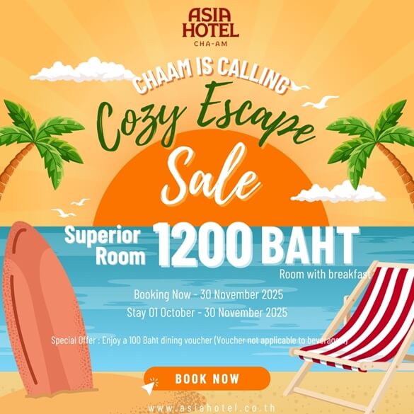 The Asia Cha Am Hotel located next to Cha Am beach, Thailand’s longest stretch of silvery sand beaches, crystal blue sea, natural beauty, warm sea breezed and great sunshine for sunbathing all day long, viewing the Gulf of Thailand between Hua Hin and Phetchaburi, offers all the conveniences of an international hotel.