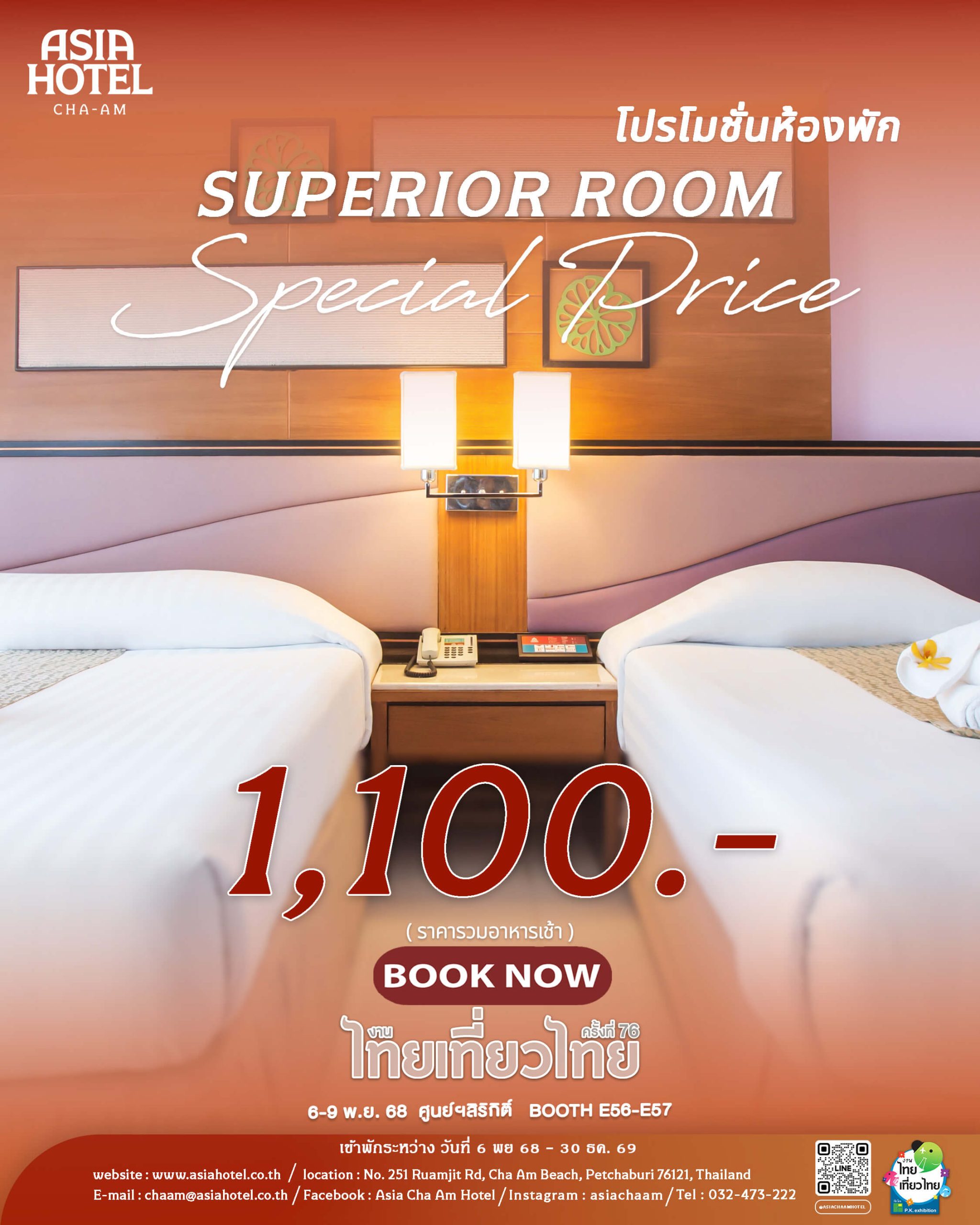 The Asia Cha Am Hotel located next to Cha Am beach, Thailand’s longest stretch of silvery sand beaches, crystal blue sea, natural beauty, warm sea breezed and great sunshine for sunbathing all day long, viewing the Gulf of Thailand between Hua Hin and Phetchaburi, offers all the conveniences of an international hotel.